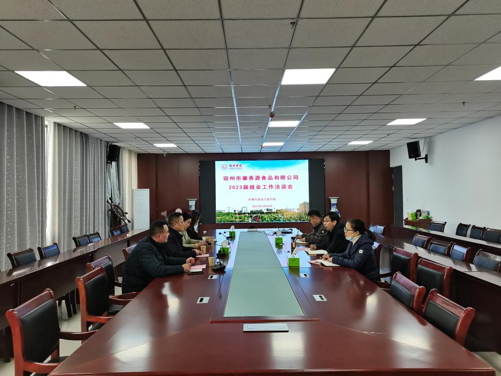程迎九对生工学院热情接待表示感谢,对于宿州学院多年来持续为徽香源食品有限公司输送高质量人才表示感谢。介绍了企业发展,特别强调了人才需求的情况,双方就如何开展校企合作以及就业方面的细节进行了沟通交流。
