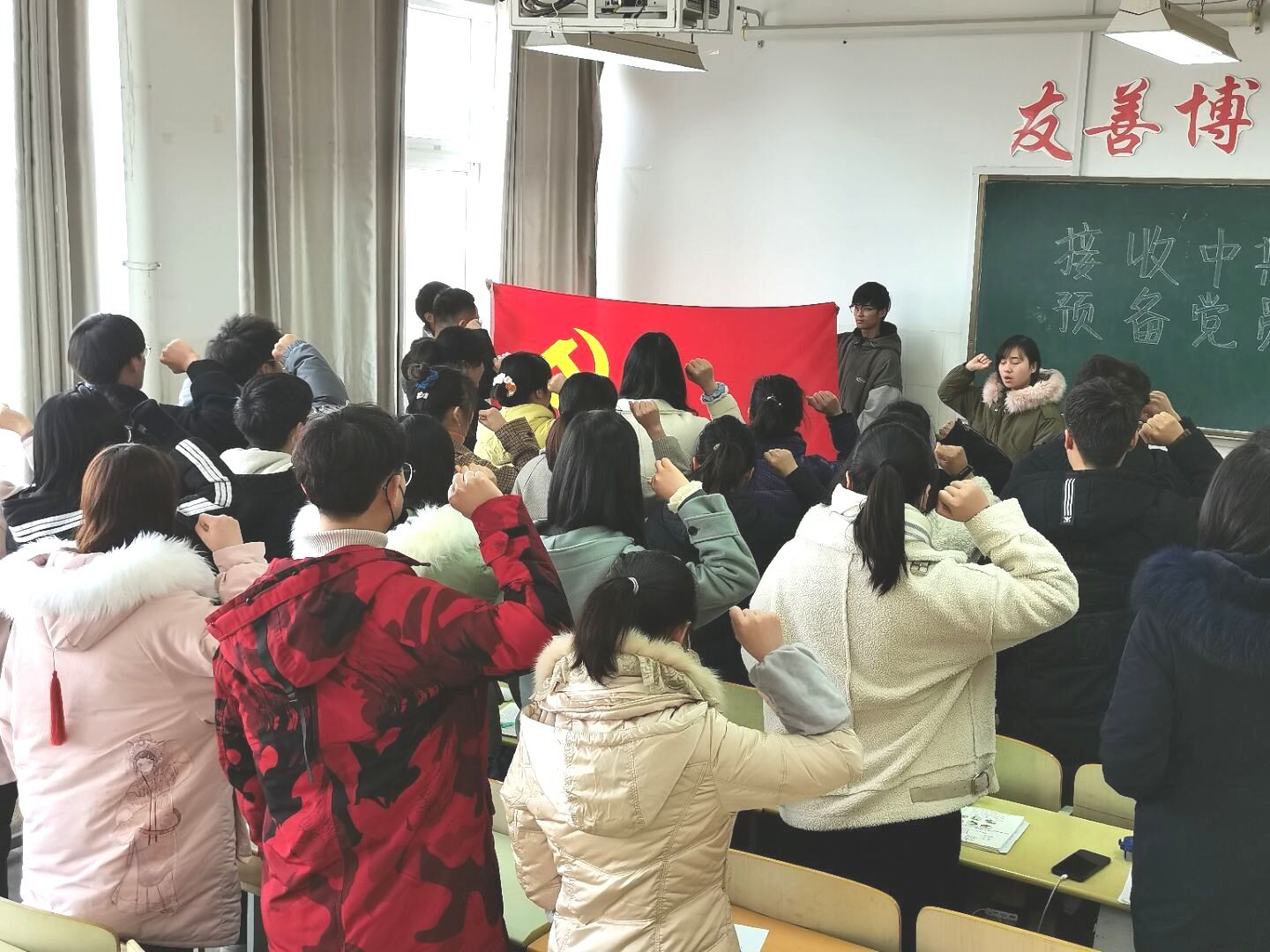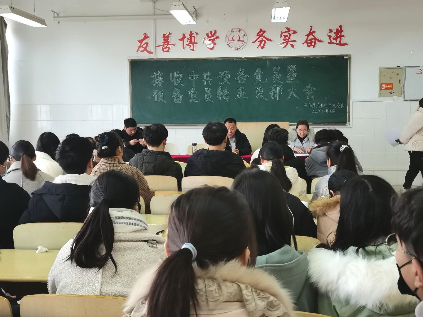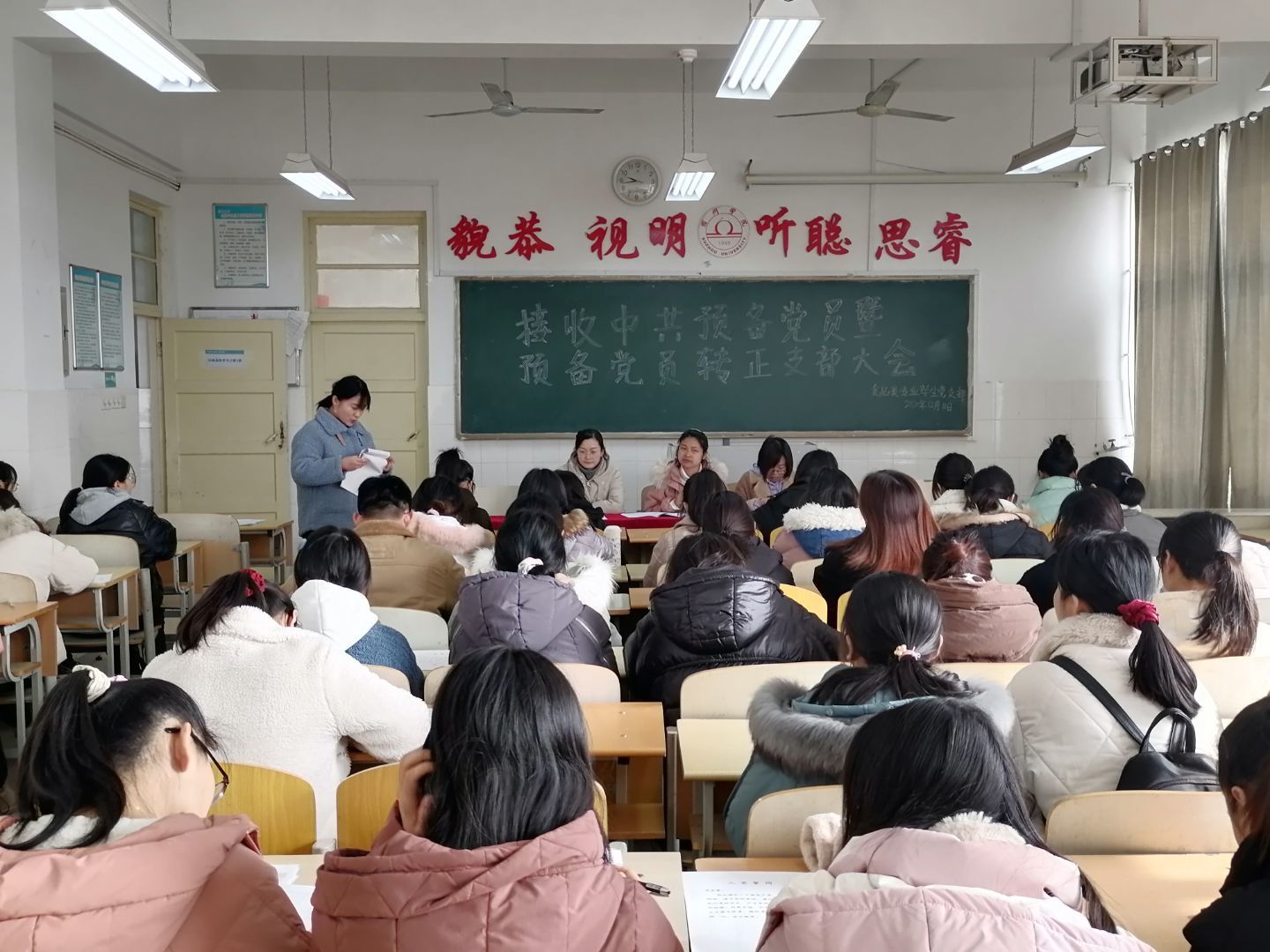 会议第二项,请预备党员宣读入党志愿书。随后由支部老师向大会报告申请人的政审情况。最后由所有参会人员举手票决,同意接收钱伟佳、于乔玲等27为同志为中共预备党员。