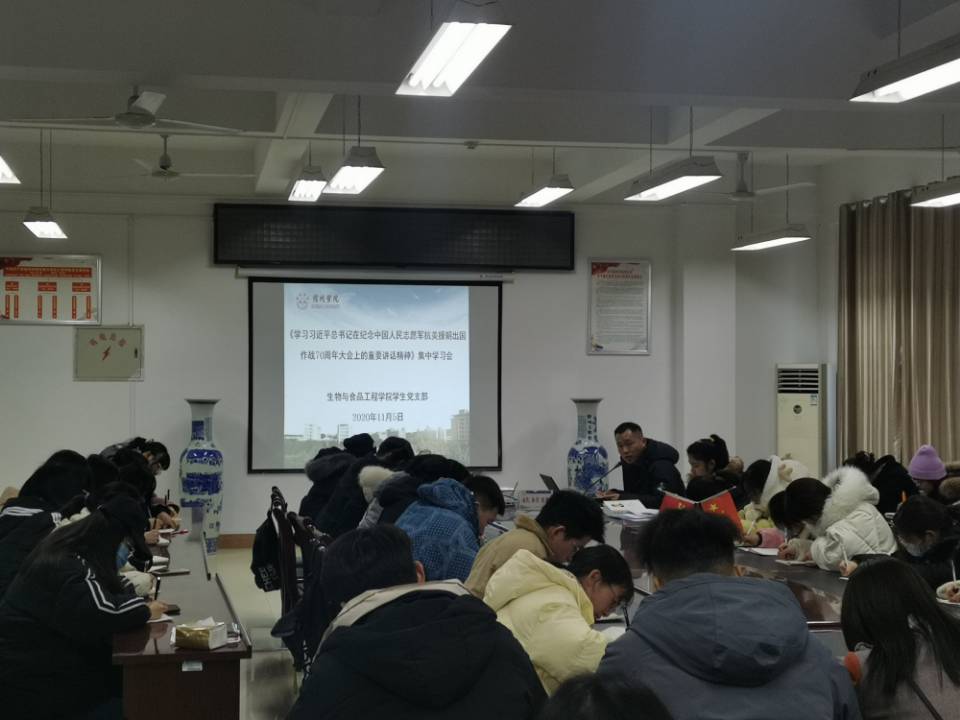 为加强学生党员素养,深入培养学生党员爱国爱党意识。11月6日下午1:30,生工学院学生党支部开展《学习习近平总书记在纪念中国人民志愿军抗美援朝出国作战70周年大会上的重要讲话精神》集中学习会。会议由生物类专业支部书记甘守伟主持,支部全体成员参加。