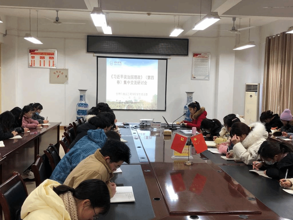 为了进一步加强学生党员学习贯彻新思想的政治自觉性,提高学生党员党性修养。生工学院生物类和食品类学生党支部于12月15日下午14:30在学院会议室开展学习《习近平谈治国理政》第三卷集中交流研讨会。会议由支部书记雷柠檬主持,全体支部党员参加。