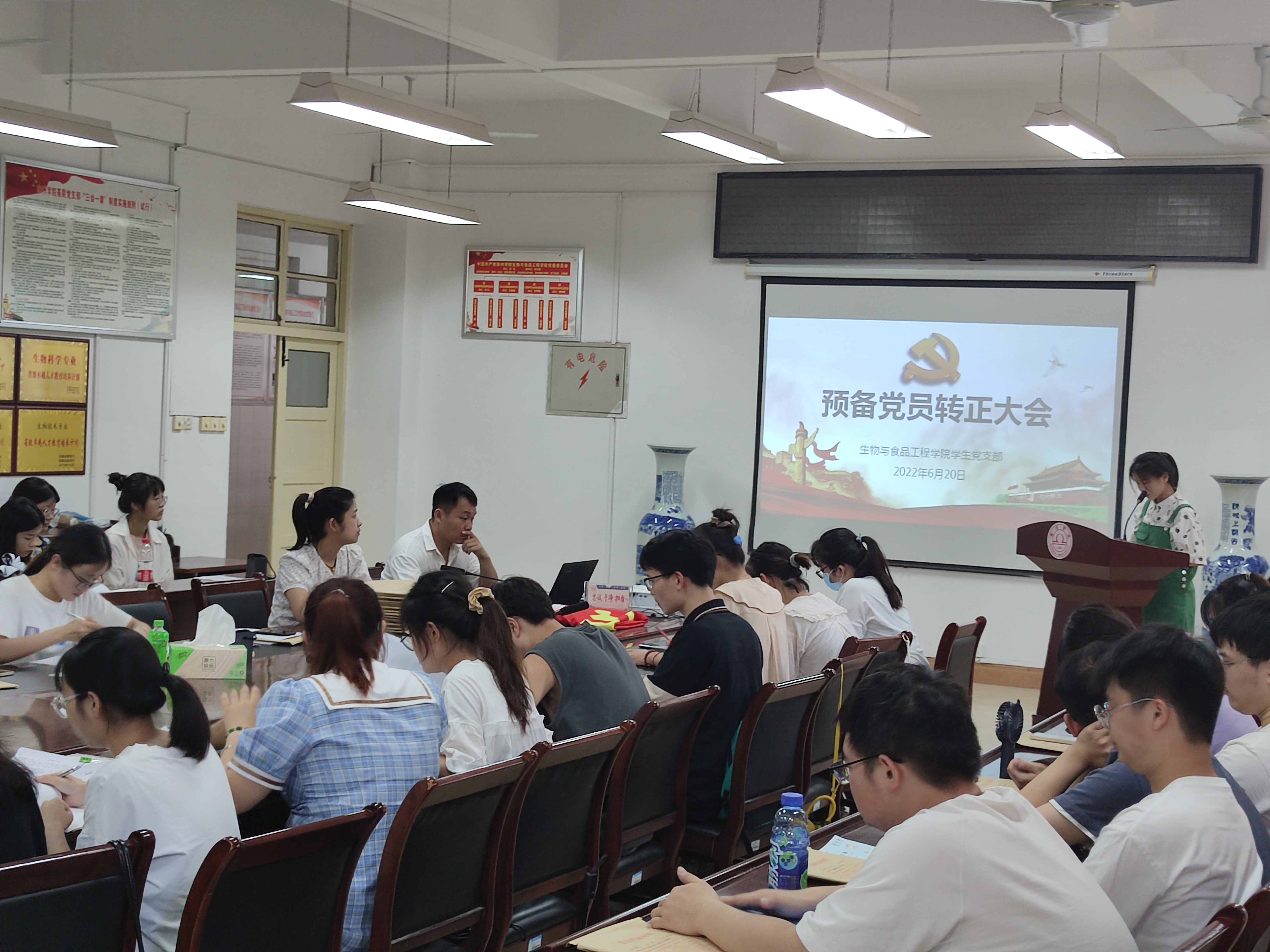 为做好发展党员工作,进一步加强党员队伍建设,生物与食品工程学院学生党支部召开2022届毕业生预备党员转正大会,大会分别由生物类专业学生党支部书记甘守伟、食品类专业学生党支部书记雷柠檬主持,参会人员有生物类专业学生党支部委员王朋朋、赵宏,食品类专业学生党支部委员李敏、苏博和在校的正式学生党员、预备党员。