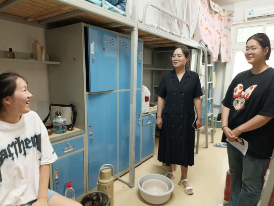 9月2日学院党委副书记李娜带领班级辅导员进新生宿舍询问同学们新学期目标规划、存在的困难等,叮嘱同学们要严格遵守学校宿舍管理规定,提高安全防范意识,注意防火、防盗、防诈骗和宿舍用电安全,保持健康良好的生活习惯,以更加积极饱满的精神状态投入到新学期的学习生活当中,不断丰富大学生活。随后辅导员凌清露立即召开开学主题教育班会,为同学们传达开学初学院相关教学工作及学院相关规章制度。
