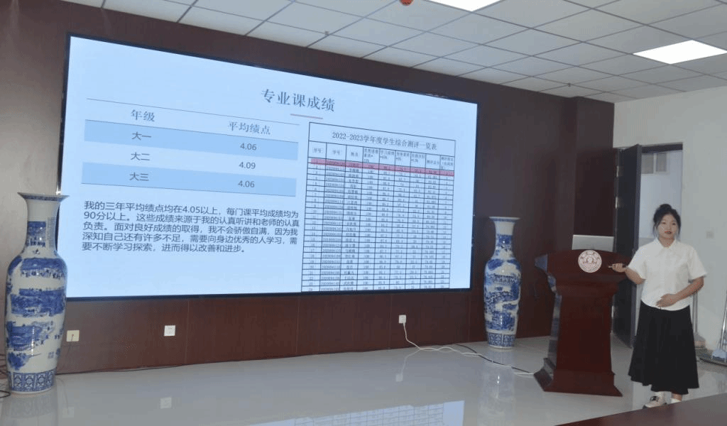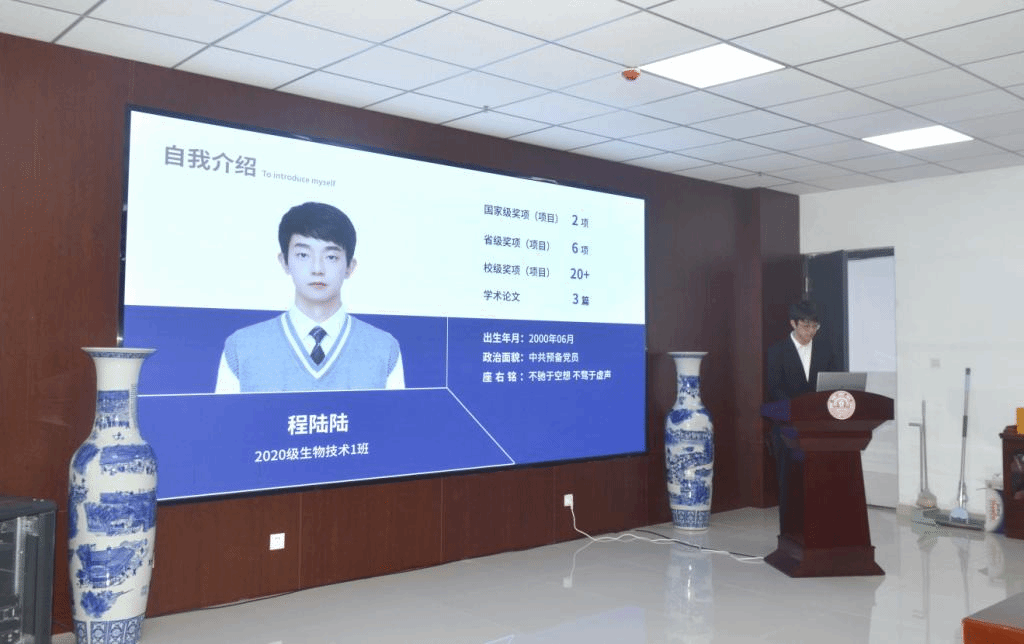 经过前期通知、学生申请和班级初评,共有四位同学进入学院评审环节并进行了现场答辩。在答辩环节中,四位候选人用心准备,精彩展示,从专业学习、思想状况、社会实践和获奖评优等方面向评审小组进行了自我风采展示,生动展现了生工学子昂扬向上的精神面貌和勤学励志的进取氛围。四位候选人汇报完毕后,院党委书记赵亮对四位同学取得的优异成绩表示了肯定和赞赏,同时也对我院学子提出了殷切期望,勉励同学们努力奋斗,不负韶华。