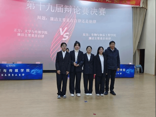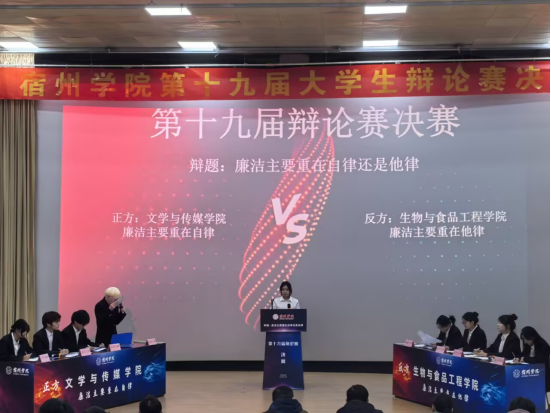 为提升我校学生的思辨能力,丰富学生课余生活,增强学生文化素质,弘扬我校文化传统,宿州学院于12月12日举办第十九届大学生辩论赛决赛,生工学院辩论队决赛现场任姗姗,钱荪宁、陈欣欣、唐佩选手一路过关斩将,气势满满,观众们翘首以待,气氛紧张而热烈。双方队伍分别就“廉洁主要重在自律还是他律”这一辩题展开辩论。生工学院身为反方以”廉洁主要重在他律“观点展开激烈辩论,最终生工学院勇夺本次比赛冠军,荣获宿州学院大学生辩论赛二连冠。