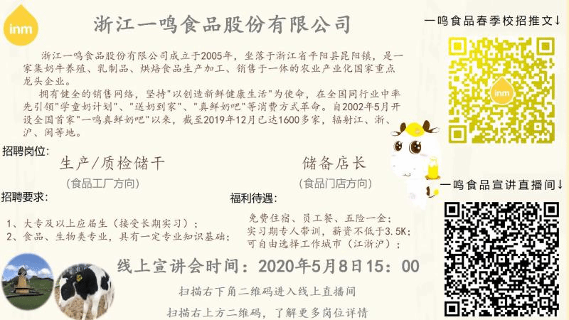 本次线上宣讲会由浙江一鸣食品股份有限公司人事叶练主讲。浙江一鸣食品股份有限公司成立于1992年,是一家集奶牛养殖、乳制品、烘焙食品生产加工、销售于一体的农业产业化国家重点龙头企业。公司拥有健全的销售网络,坚持“以创造新鲜健康生活”为使命,在全国同行业中率先引领“学童奶计划”、“送奶到家”、“真鲜奶吧”等消费方式革命。自2002年5月开设全国首家“一鸣真鲜奶吧”以来,截至2019年1月已达1600多家,辐射江、浙、沪、闽等地。