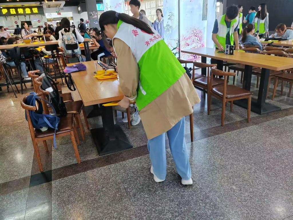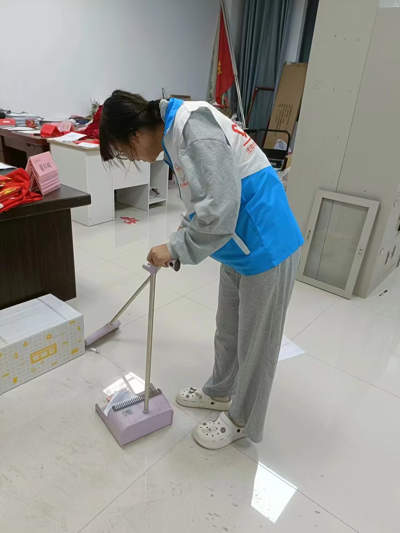 各小组分工明确,按时到达指定地点,井然有序地开展活动。在图书馆,志愿者们把读者还回的图书按类别推到不同的楼层,分类排序,依次上架;在教学楼A楼教室,志愿者们擦去黑板上的字迹、抹去讲台上的灰尘并清理掉课桌桌肚中的垃圾;在女生11栋和15栋宿舍楼,志愿者们将楼道里的垃圾集中起来,运送到楼外的垃圾箱;在一食堂,志愿者们一手拿着抹布,一手拿着餐盘,及时清理掉油腻的餐桌垃圾;在办公室,志愿者们一手拿着扫把,一手拿着簸箕,清扫垃圾。天气炎热,汗水浸透了志愿者们的衣服,但他们洋溢着青春气息的脸上都挂着笑容,保质保量地完成了各项任务。