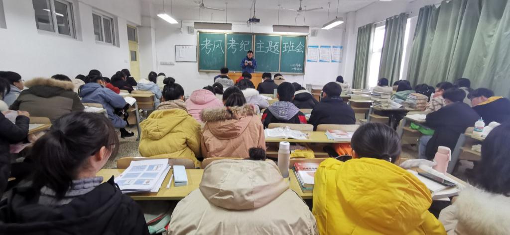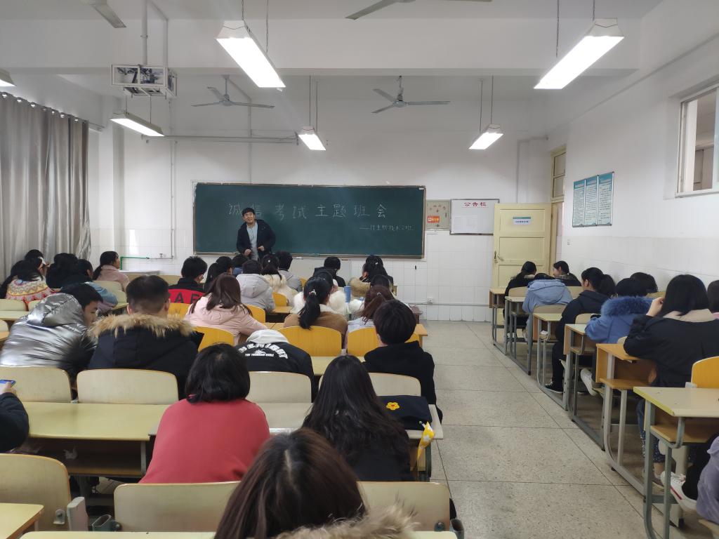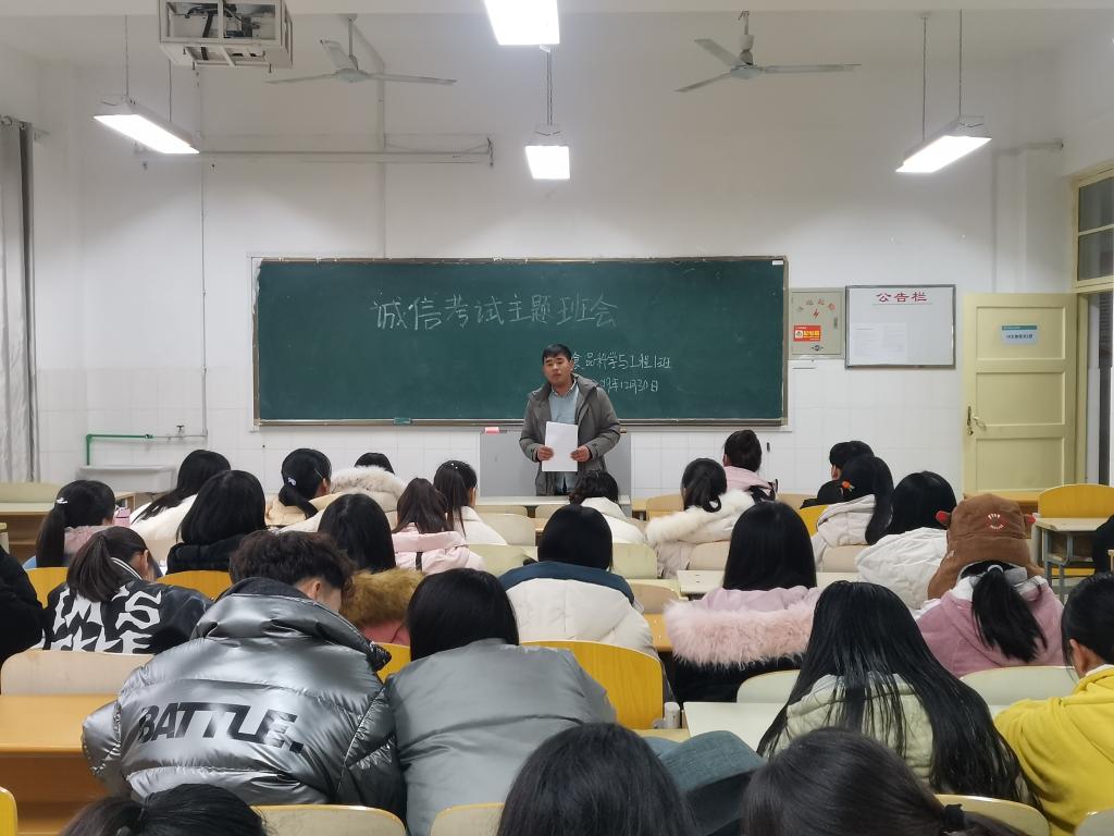 17、18、19级各年级以各个班级为单位、以各班辅导员(班主任)为组织者于第十八周组织召开诚信考试主题班会。班会旨帮助学生树立良好的行为规范和优良的考试修养,建设学院良好的学习风气。在主题班会中,由学习委员进行朗读诚信考试承诺书,将考试作弊行为的处罚条例和学业影响为同学们一一言明,并鼓舞大家诚信考试、拒绝作弊,号召大家树立起集体与个人荣辱感。诚信考试承诺书宣讲完毕后,各班同学都需要在本班诚信考试承诺书上进行签名,表明自己诚信考试的决心。诚信考试主题班会既有利于学院良好学风的建设,同时对于学生优良品德的树立有着很好的帮助,考试作弊虽然看起来是一件小事,实则影响很大,因为一种不好的行为一旦有了开端,后续便很难止住,所以诚信考试不是一件容易的小事。