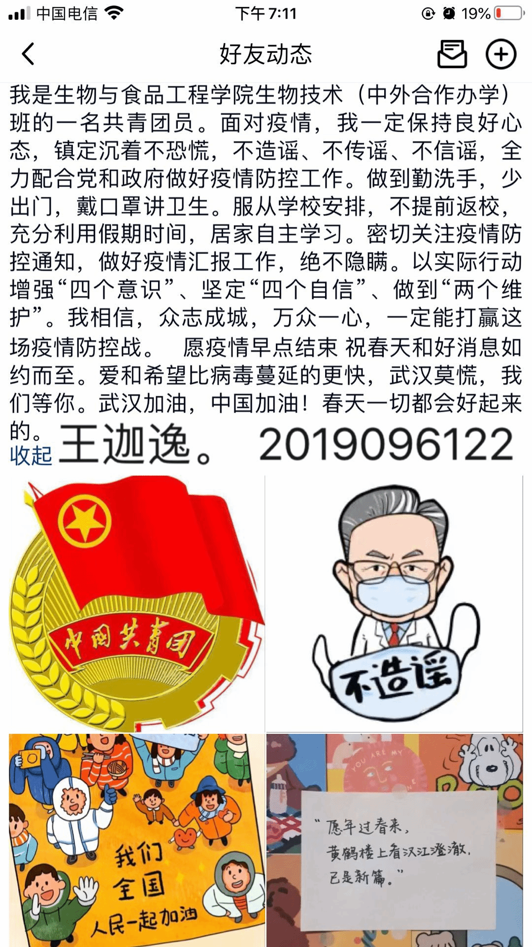 各班级团支部高度重视,精心设计,认真开展主题团日活动,共17个团支部积极行动,开展了“打卡”报平安、预防手册大学习、防控技能get起来以及“我倡议,我承诺”宣誓活动。通过主题团日活动,引导支部成员统一思想、坚定信念,树立正确的疫情观,普及宣传防控知识,坚决抵制传谣造谣,倡导健康居家生活等。同时,各支部成员在活动中开展了热烈的互动讨论,分享自身关于防疫的常识技巧,由衷地送出“武汉加油”“中国加油”“战疫必胜”的祝福,将团日活动的气氛推向了高潮。据统计,活动期间累计有支部成员、学生家长等1000多人参与学习互动,取得良好的活动成效。19食品质量与安全等团支书在学习后表示:虽然我们不能面对面、手拉手,但我们可以心连心,肩并肩。我们都是生工青年学子,一定会牢记习近平总书记的嘱托,自觉肩负起时代赋予的使命和责任,居家战“疫”,做好防护,用实际行动践行“守护者”“修行者”和“识途者”的新要求。