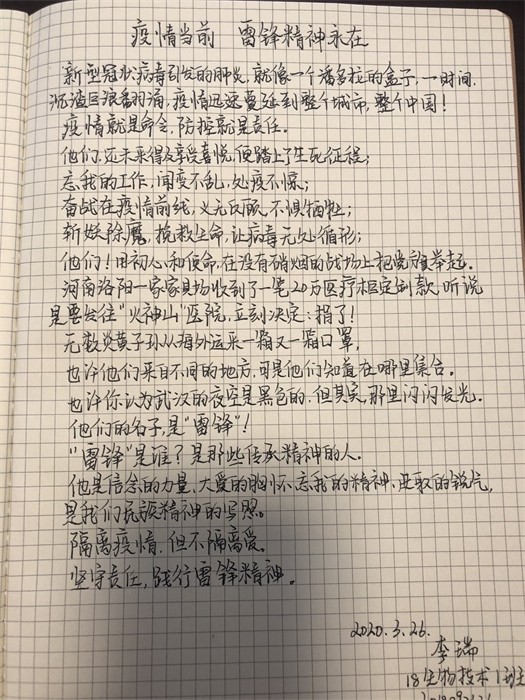 为做好疫情期间学生德育思想教育工作,学习雷锋精神,传承雷锋精神,向逆行先锋英雄致敬。3月28日,生工学院于线上举办了2020年“书写暖心事迹,发扬雷锋精神”主题书法活动。