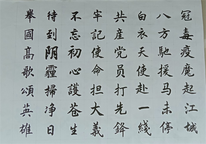 在这一场没有硝烟的疫情阻击战中,涌现出了一大批的“活雷锋”和逆行先锋,他们不惧危险、勇往直前。从他们身上我们看到了“雷锋精神”的传承。为赞扬这种精神,参赛选手们在小小的方格之间挥洒书写之豪气,作品或气质敦和,或雍容大方,或端正俊丽。各具特色的同时,又流露出对逆行先锋的敬佩之情。最终,19食品科学与工程班王家峰等获得一等奖,19食品质量与安全班程龙等获得二等奖,18生物技术1李瑞等获得三等奖。