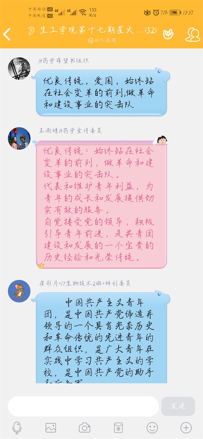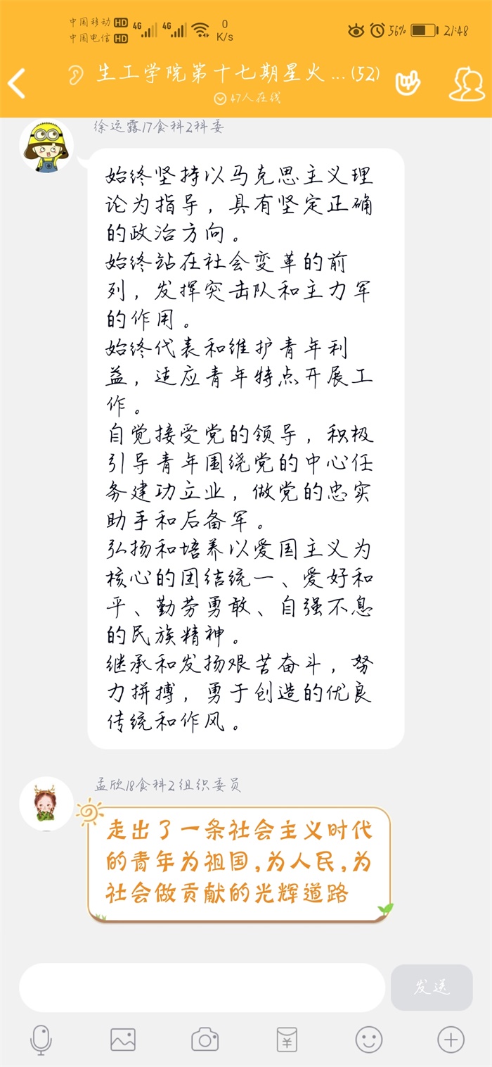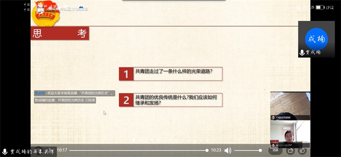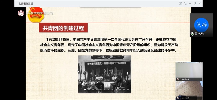 4月27日,生工学院于线上开展星火团校风雨兼程,初心不改--共青团历史与发展讲座主题讲座,生工学院团副贾成楠应邀主讲。