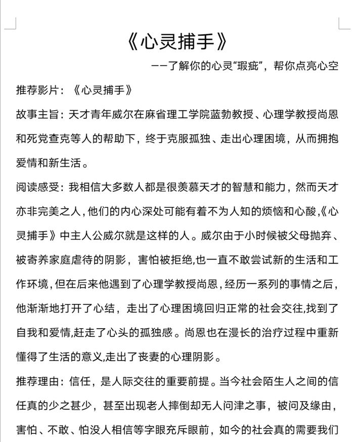 电影治愈了人们的心灵,给人们在生活中提供了创造性的灵感,为了帮助同学们了解心理健康的重要性,5月18日,生工学院于线上成功举办2020年“点亮心空,书影随行”书籍影片分享活动,共收到47份参赛作品。
