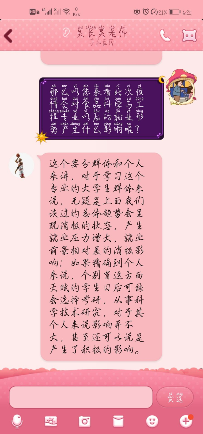 为深入学习贯彻习近平新时代中国特色社会主义思想,引导青年学生走出校园、了解国情。结合当前疫情防控实际,7月15日--22日,生工学院就业形势调研团在线上进行了食品科学与工程专业就业形势云调研活动。吴长昊担任指导老师,共3名志愿者参与此次实践活动。