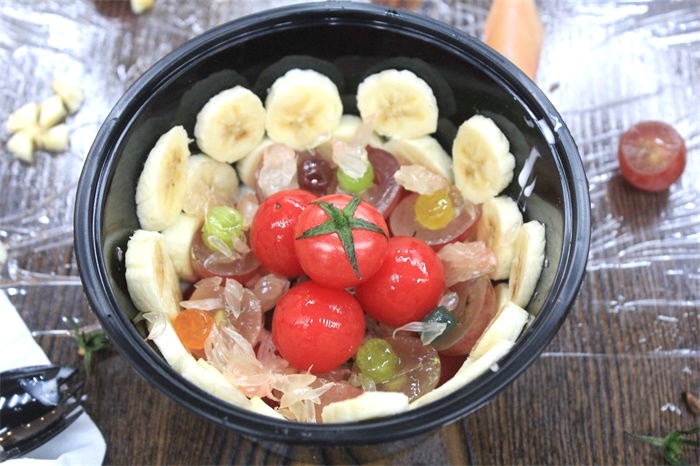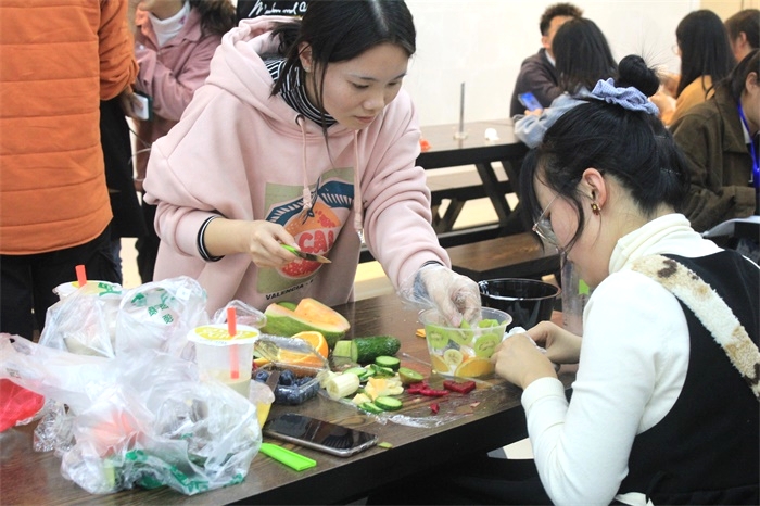 比赛开始前,工作人员将提前准备好的酸奶、保鲜膜、塑料盒和勺子分到每一参赛小组。比赛时,各组参赛人员分工明确,有条不紊的进行着作品创作。有的将不同颜色的水果一层一层的摆放,有的将水果切成各种形状进行装饰。随着时间的推移,她们逐渐完善自己的作品。完成作品后,参赛选手提交作品并进行命名,由评委进行打分。之后,同学们进行桌面的清洁并共享自己的劳动成果。评分结束后,工作人员统计分数进行汇总。最终,20药学聂羲等2人荣获比赛一等奖、20食品质量与安全史峰等6人荣获比赛二等奖、19食品科学与工程何元洁等9人荣获比赛三等奖。