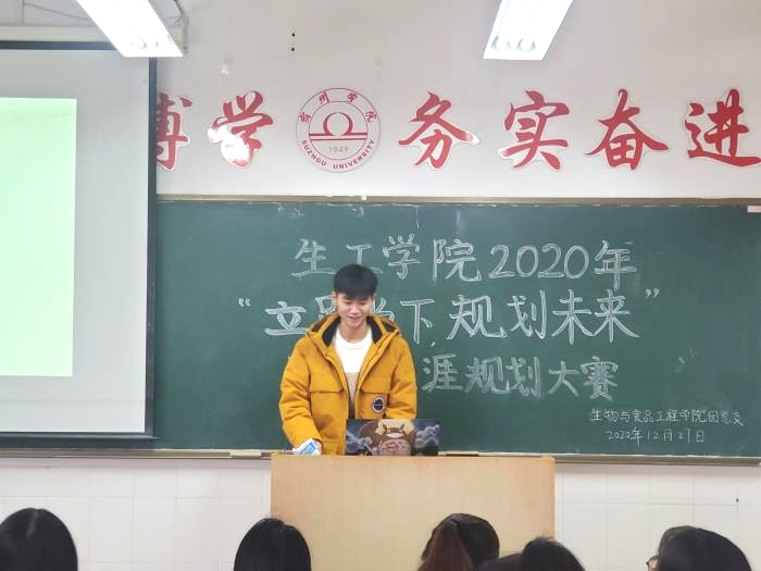 活动开始前十分钟参赛者纷纷到场进行签到。活动开始后,同学们依次上台就“立足当下,规划未来”的主题,以PPT演讲的方式介绍自己的未来职业生涯规划。每位参赛者都根据自身的特点,理智地分析了自己的优缺点,并据此规划了自己的职业生涯,也让在座的其他参赛人员获益颇多。关于未来规划,不少同学都提出有考研的计划,并表示会为之付诸行动,赢得了大家的掌声。最终,经过评委的评定,19食品科学与工程王秀风等3人获得一等奖,20食品质量与安全胡若林等6人获得二等奖,20生物技术(中外)孟鹏鹏等7人获得三等奖。