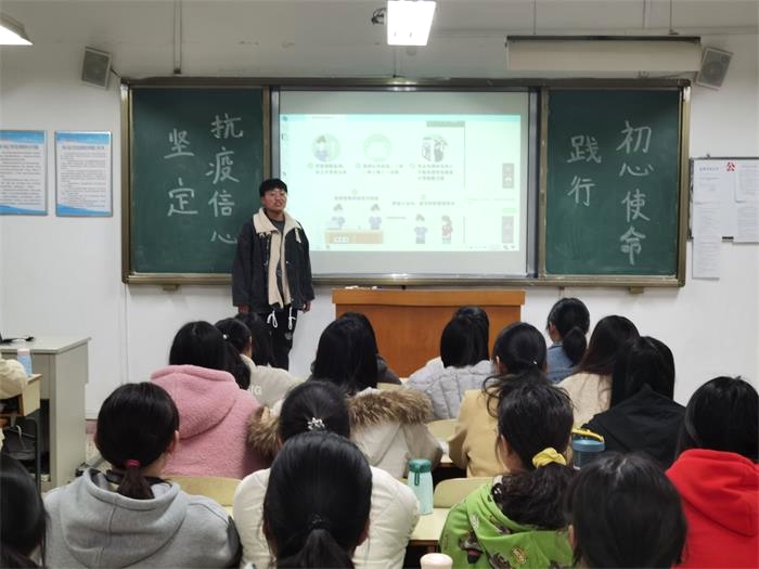 活动开始,各个班级负责人用精心准备的PPT向同学们进行“新冠肺炎疫情防控知识”的普及和指导。以全面细致的讲解和通俗的引例向同学们传述针对疫情防控中的班级防控须知、个人防护常识以及疫情传播途径等相关知识。并且提到关于接种新冠疫苗的必要性,强调只有在人群中逐步建立起免疫屏障,才能阻断疫情流行。在座同学认真听讲,并在学习结束之后提出问题,班级负责人耐心答疑解惑。在班级防疫知识学习中,同学们认识到自我防护的重要性,并承诺严格遵守关于疫情防控的各项规定。