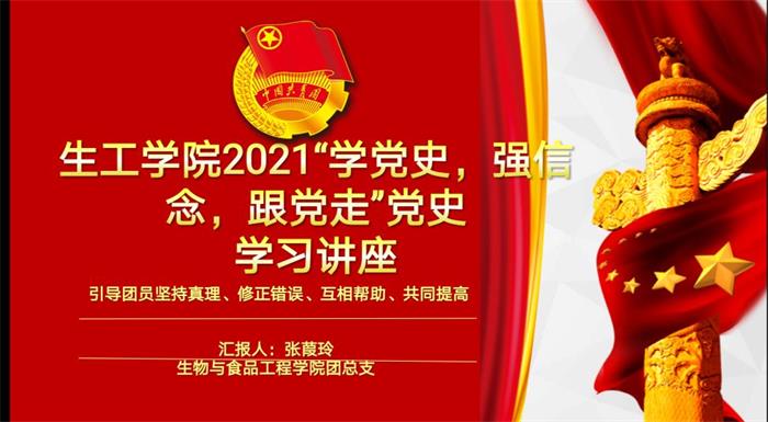青年兴则国家兴,青年强则国家强。为坚定青年一代的理想信念,加强党的宗旨意识。5月9日下午,生工学院于实验楼A521举办2021“学党史,强信念,跟党走”党史学习讲座。本次讲座由张葭玲担任主讲人。
