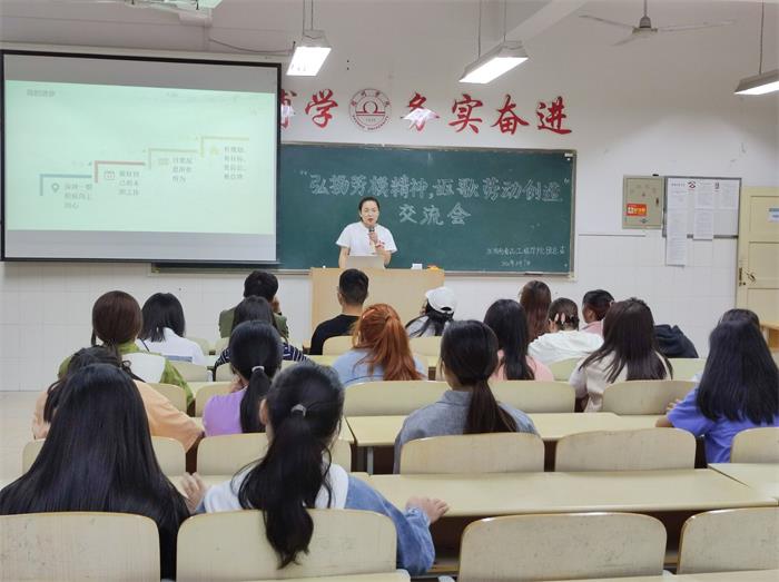 会议伊始,徐晨凤结合自身经历进行劳模精神演讲,向同学们宣传劳模精神的具体含义。从徐晨凤慷慨激昂的演讲中,我们了解到,劳模精神是时代精神的生动体现,是引领时代新风的精神高地,是社会主义核心价值观的生动诠释。接着从自己的学习经历,向同学们分享她的学习心得,并告诫同学们要自省自律,保持一颗积极向上的心。演讲结束后,现场讨论气氛依旧高涨,同学们互相讨论新时代的“劳模精神”,纷纷认为此次交流会使自己受益匪浅,感触良多。