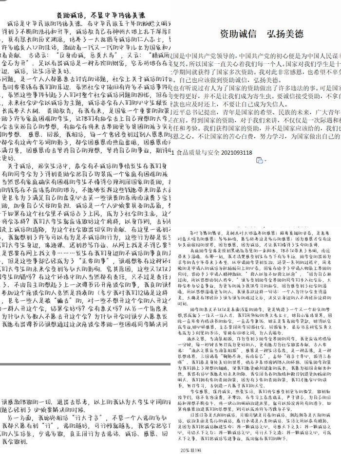 诚,是为人之本;信,是立身之道。人无信,则不立;家无信,则必衰;国无信,则必危。自古关于诚信就有曾子杀彘、尾生抱柱、商鞅立柱为信、季诺一诺千金等典范。所以说,诚信就是中华民族的光荣传统。同学们主要以记叙文,议论文的形式深切的表达出自己对诚信的认识与感悟,紧扣资助诚信这一主题。评委们认真阅读,公正评分。最终,21级生物技术2班赵威等2人获得一等奖,21级食品科学与工程余慧等3人获得二等奖,21级药学王子怡等5名同学获得三等奖。