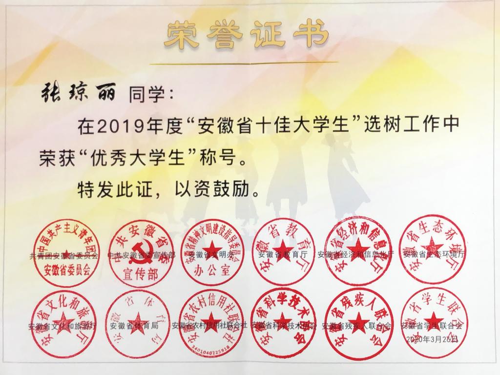 经团省委、省委宣传部、省文明办、省教育厅、省经信厅、省生态环境厅、省文化和旅游厅、省体育局、省联社、省科协、省残联和省学联研究,公布了2019年安徽省“农金杯·安徽省十佳大学生”大学生获奖者名单,生工学院张琼丽被授予“安徽省优秀大学生”称号。