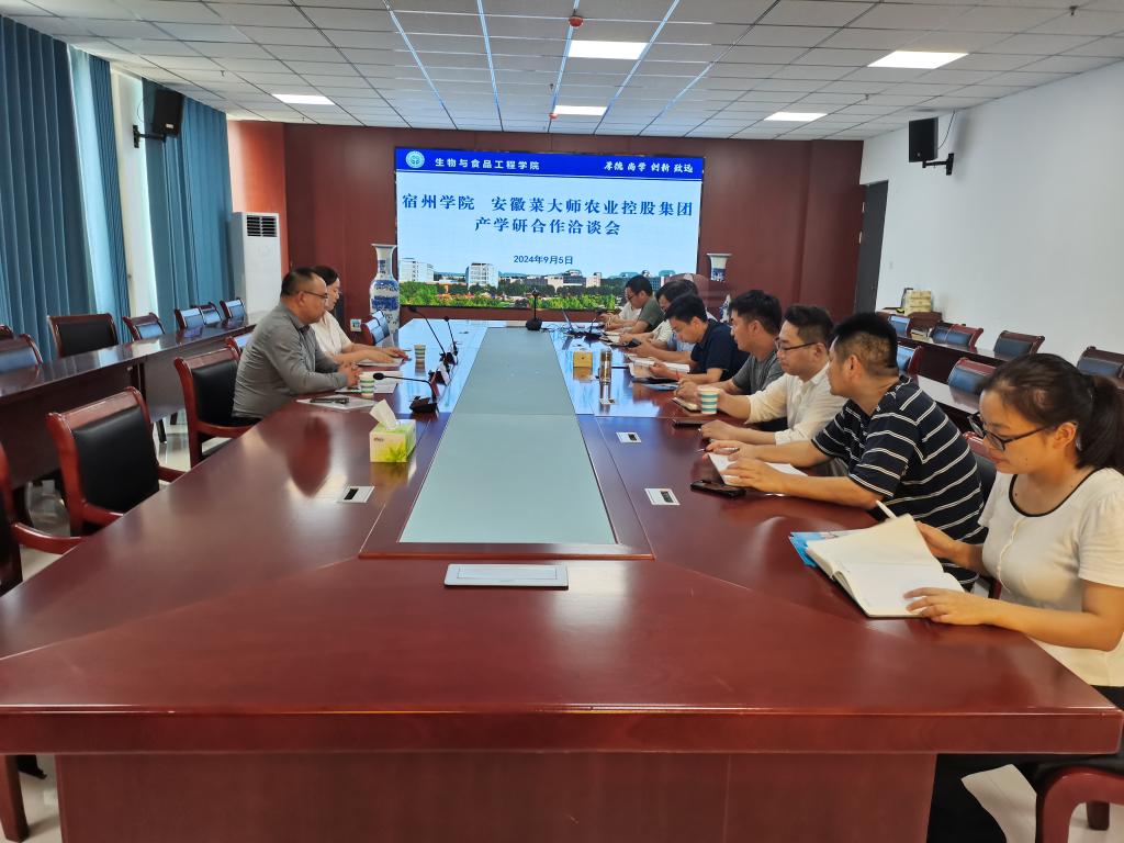 2024年9月5日下午,宿州菜大师新志食品公司总经理屠然然和宿州菜大师采销副总娄志丹来生工学院进行实地走访,并开展校企合作洽谈会,生工学院院长张兴桃,党委副书记(临时负责)刘超,科研秘书姚沛琳,实习实训中心主任张东京及相关食品专业博士教师参加了此次洽谈会。