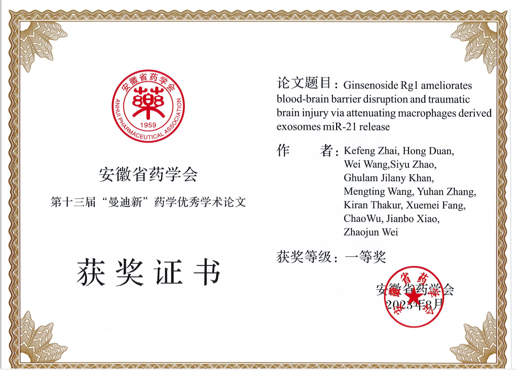 生工学院翟科峰教授的论文《Ginsenoside Rg1 ameliorates blood-brain barrier disruption and traumatic brain injury via attenuating macrophages derived exosomes miR-21 release》荣获一等奖。