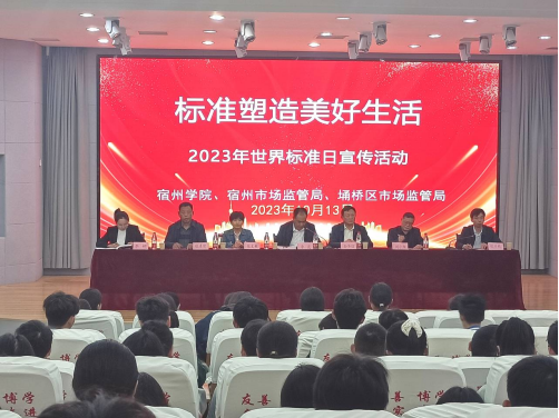 会上,宿州市市场监管局二级调研员孙华信致辞,深刻阐述了世界标准日的来源、目的和意义,同时对宿州市标准化工作提出了新的希望和要求。宿州学院党委委员、副院长李亮致欢迎辞,并简要介绍了学校办学概况以及标准化建设情况。李亮指出,伴随着经济全球化深入发展,标准化在便利经贸往来、支撑产业发展、促进科技进步、规范社会治理中的作用日益凸显。标准已成为世界“通用语言”。世界需要标准协同发展,标准促进世界互联互通。他指出,我校将此次标准日宣传活动为契机,结合本届世界标准日主题,认真落实《国家标准化发展纲要》和《安徽省人民政府关于贯彻落实<国家标准化发展纲要>的实施意见》,强化领导、凝聚合力、细化方案、周密计划、精准发力,充分发挥我校高层次人才力量,加大在国家标准、地方标准、行业标准等标准方面的工作力度,进一步贡献宿州学院科技创新力量。