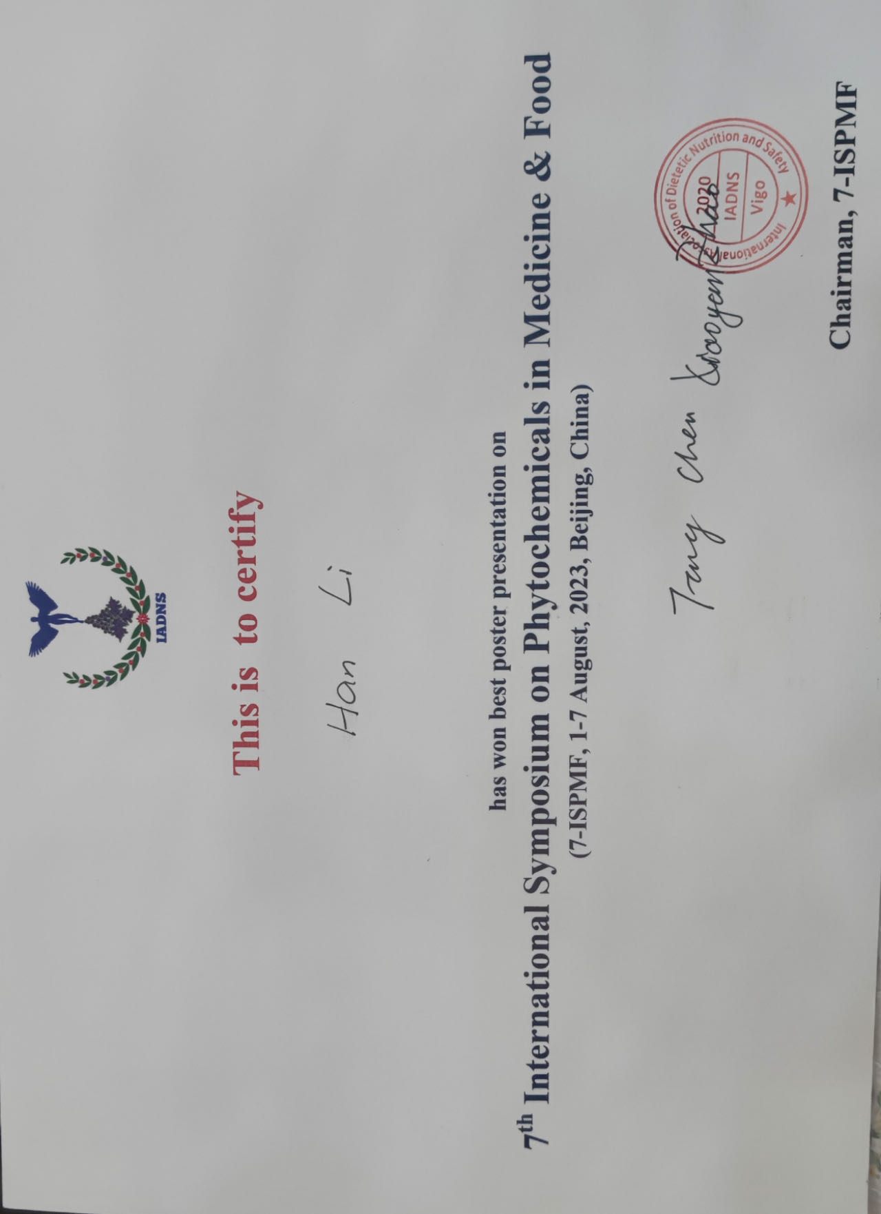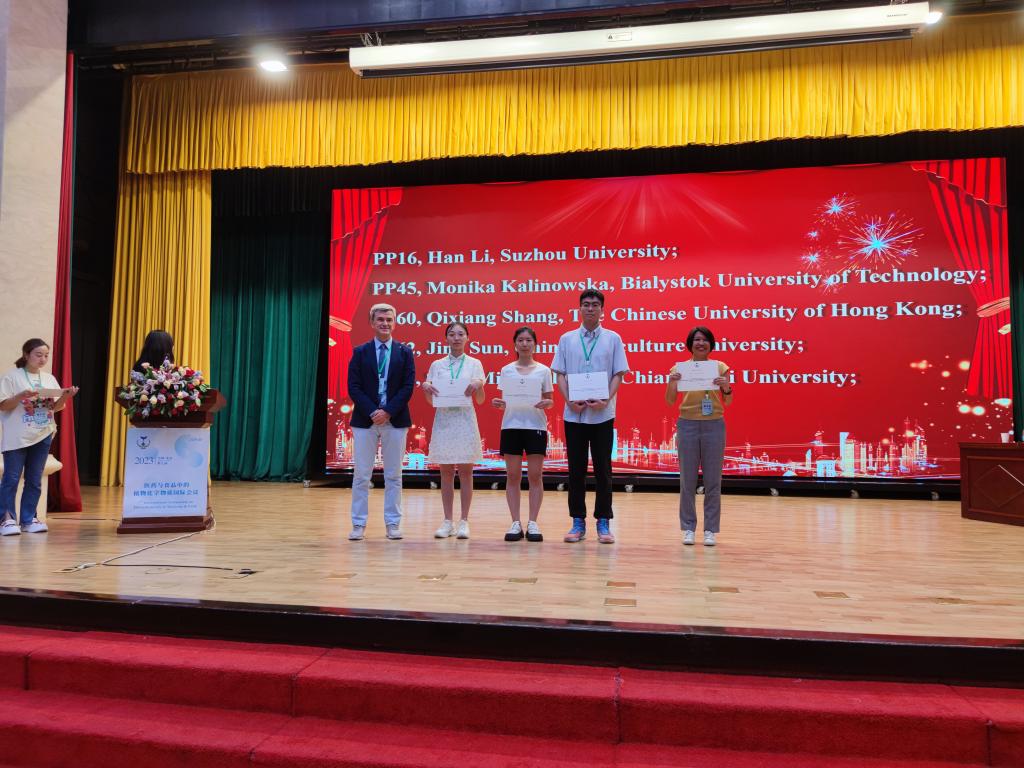会议期间,翟科峰教授介绍了宿州学院生物与食品工程学院在天然产物与食品科学领域的最新研究进展,还与境内外专家就合作研究项目进行了深入的洽谈,探讨了共同关心的科研问题,商讨了未来在该领域的合作计划。3名硕士研究生积极参与墙报的展示与角逐,翟科峰教授指导的硕士研究生李晗斩获最佳海报奖,其题目为“Protective effects of Isodon Suzhouensis extract and glaucocalyxin A on chronic obstructive pulmonary disease through SOCS3–JAKs/STATs pathway”。