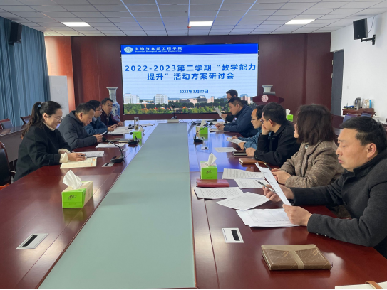 为更好的贯彻实施学校关于开展2022-2023学年第二学期“教师教学能力提升”活动的通知精神,3月20日上午,生物与食品工程学院在学院会议室召开2022-2023第二学期“教学能力提升”活动方案研讨会,学院领导、教务科、教研室主任等参加会议。