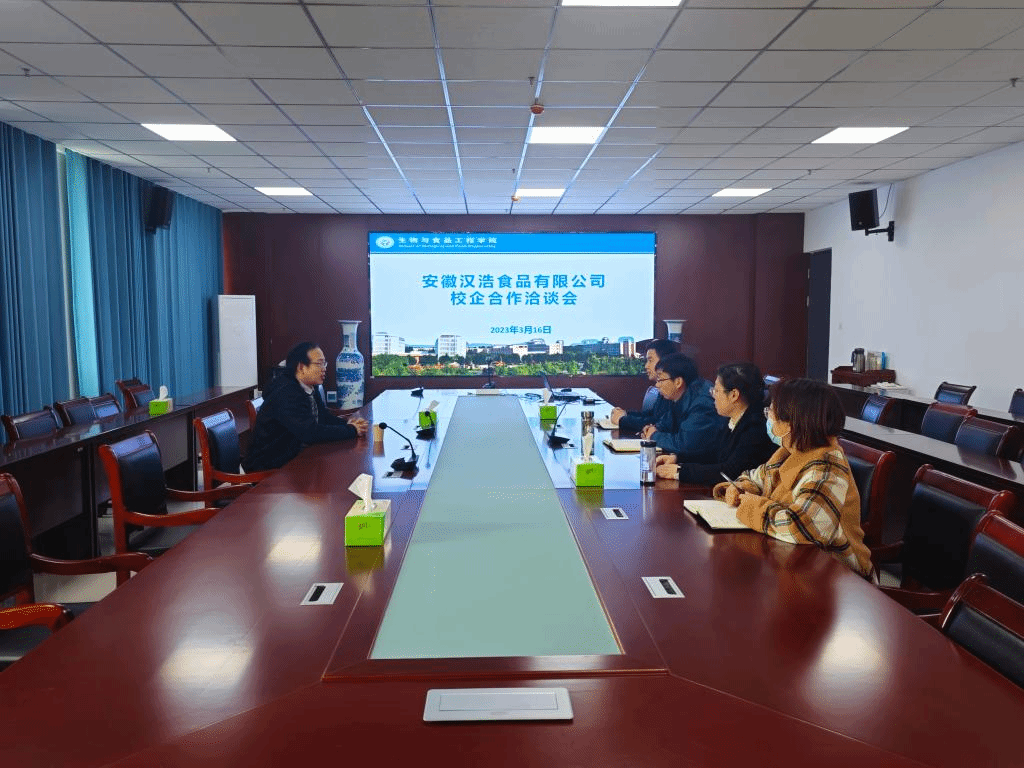 2023年3月16日上午,安徽汉浩食品有限公司总经理王景源来到生工学院开展校企合作洽谈,生工学院党委副书记、院长张兴桃,副院长翟科峰及食品专业教师鲍妮娜博士参加了此次洽谈会。