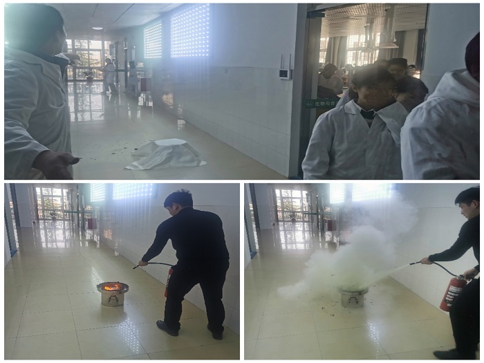 近百名师生参与演练。首先,学生代表演示强酸泼溅的应急处理方法,包括如何处理溅出的酸液和救助受伤人员等。随后进行紧急疏散演习,模拟由于实验室线路老化突发火灾的应急处理。实验教师引导学生有序疏散到指定疏散地点。最后,进行了灭火器的操作方法和注意事项的讲座学习,并模拟小型火情,组织学生安全使用灭火器进行灭火演练。本次演练组织严密、措施得力,达到了预期的目的。