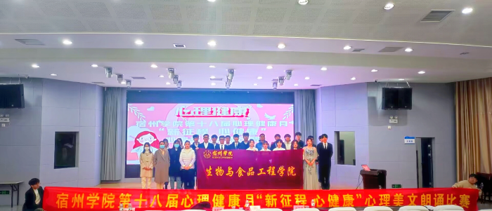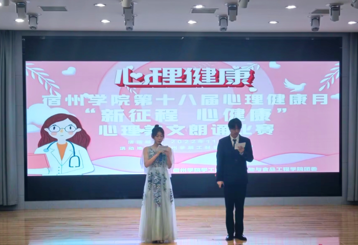 为了响应国家“关注大学生心理健康问题”的号召,提高大学生的心理素质,增强大学生建立健康心理意识。由宿州学院党委学生处、校团委主办,生工学院承办的第十八届“新征程 新健康”心理美文朗诵比赛于2022年11月28日晚在宿州学院工科楼报告厅举办,全校学生积极参加。