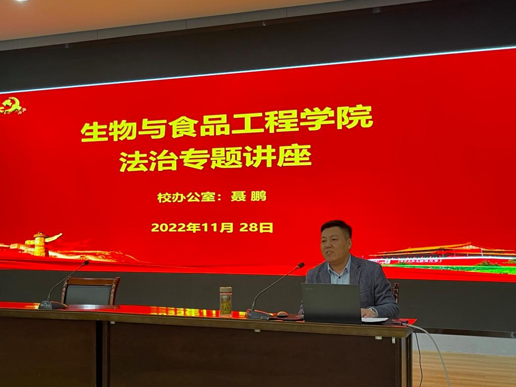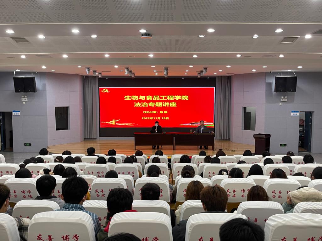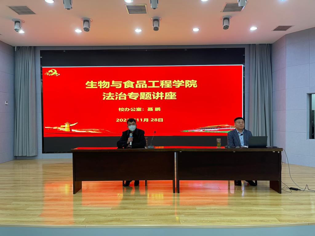 为学习宣传贯彻党的二十大精神,增强学生法律意识,提高学生防诈骗意识,营造文明、平安、和谐的校园育人环境,11月28日晚在工科楼招聘大厅,生物与食品工程学院邀请学校法治科科长聂鹏,为学院2022级全体新生及各班级法治宣传员作法治教育专题讲座。讲座由生工学院党委副书记、院长张兴桃主持。