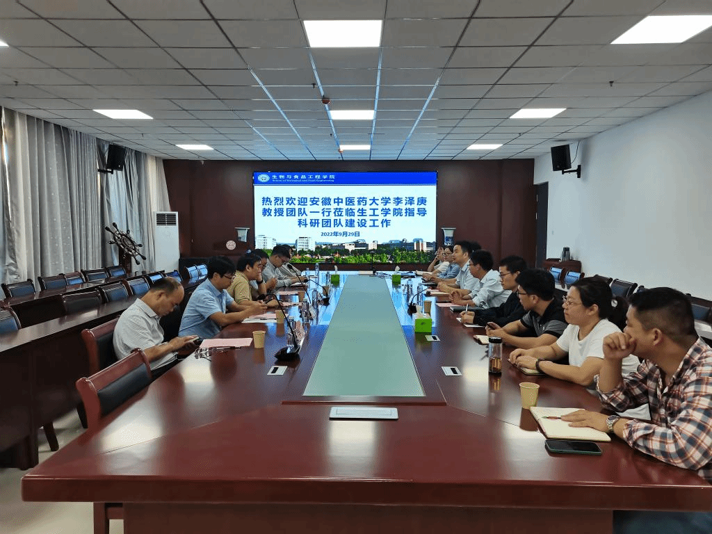 2022年9月29日下午,安徽中医药大学李泽庚教授团队一行到生工学院指导科研团队建设工作。生工学院党委副书记、院长张兴桃,副院长翟科峰及部分博士教师参加了本次会议。