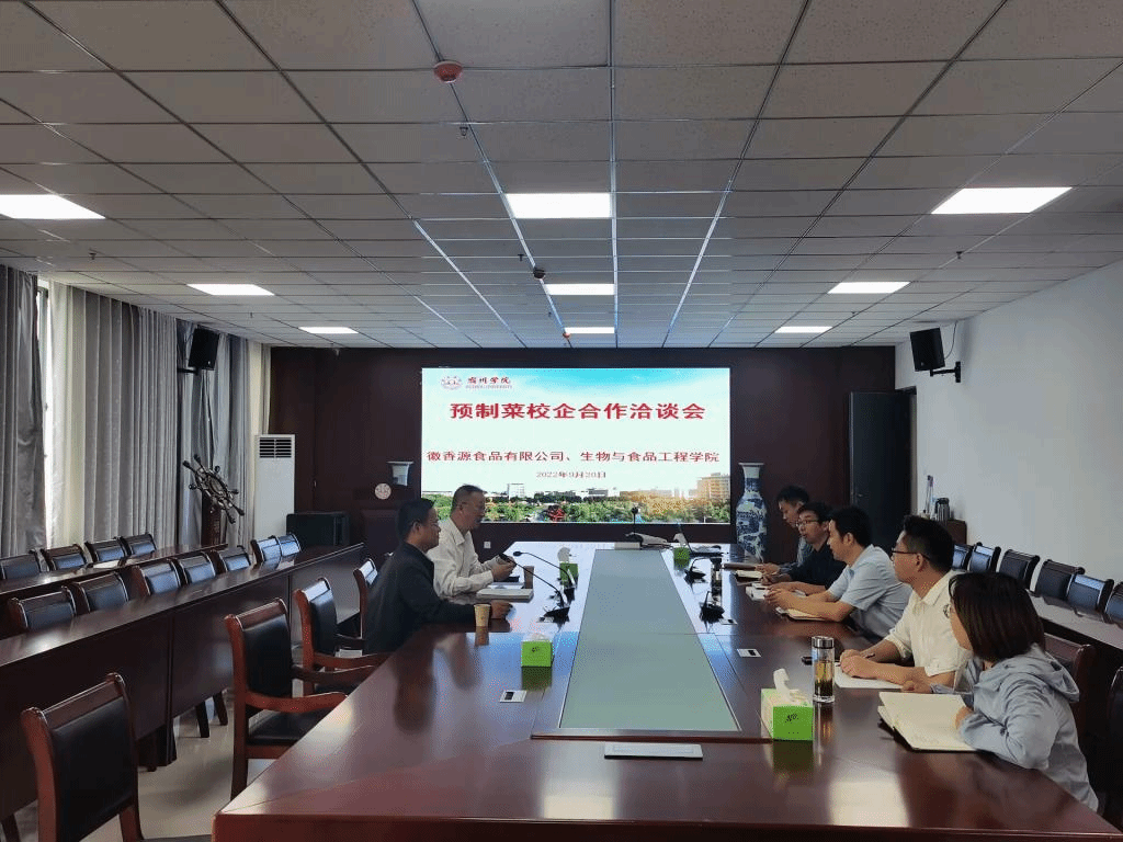 2022年9月20日上午,徽香源食品有限公司总经理程迎九、人事总经理韩立杰到生工学院洽谈预制菜校企合作事宜。