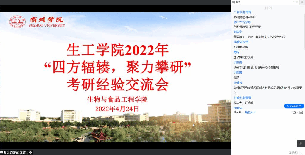 为更好的帮助生工学子确立正确的奋斗就业目标,及时解决考研中遇到的各种困难,更好地摆正自己的人生规划,生工学院在4月24日下午线上成功举办“四方辐辏,聚力攀研”考研经验交流会活动。