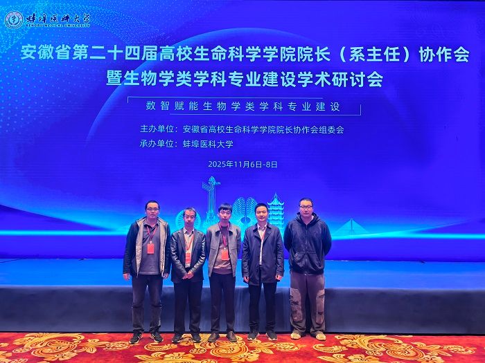 2025年11月6日-7日,生物与食品工程学院党委副书记、院长张兴桃,副院长(教学)王海潮,副院长(科研)翟科峰,组织员刘卓成和实习实训中心主任张东京一行5人参加由安徽省高校生命科学学院院长协作会组委会主办、蚌埠医科大学承办的“安徽省第二十四届高校生命科学学院院长协作会暨生物学类学科专业建设学术研讨会”。来自全省21所高校的生命科学学院院长(系主任)及相关专家参会。