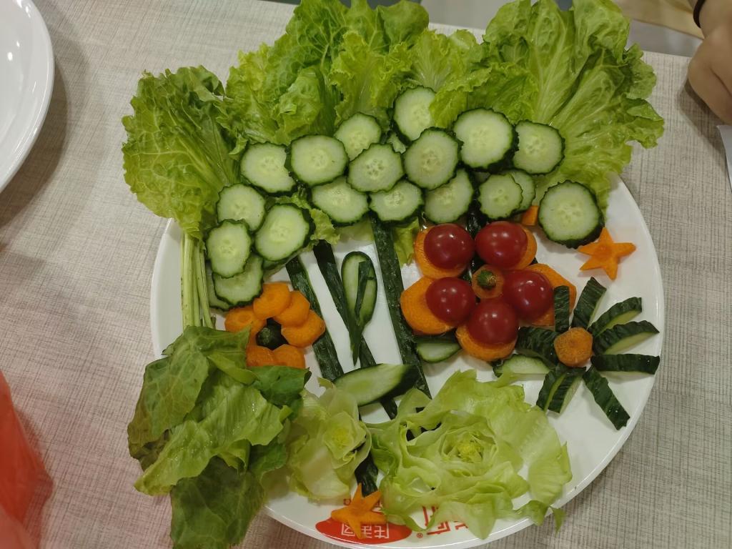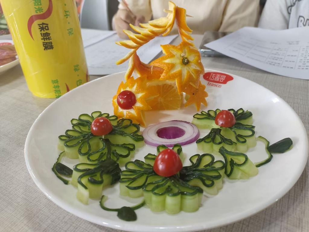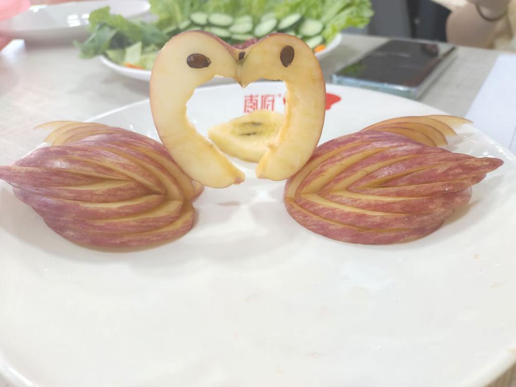 在工作人员的辛苦协助下,本次活动顺利展开。活动初期参赛组在比赛开始前十五分钟到场签到并被安排比赛位置,选手两人一组。用所带卫生、安全、新鲜的食材进行果蔬堆砌画比赛。比赛时的保鲜膜、盘子、手套由比赛工作人员准备好,选手只需携带水果蔬菜和小刀比赛即可。学生们创作新颖,奇特,且作品十分有趣味。创作后由评委在水果口感及营养,主题创意,摆盘设计,卫生处理等四方面进行评分。