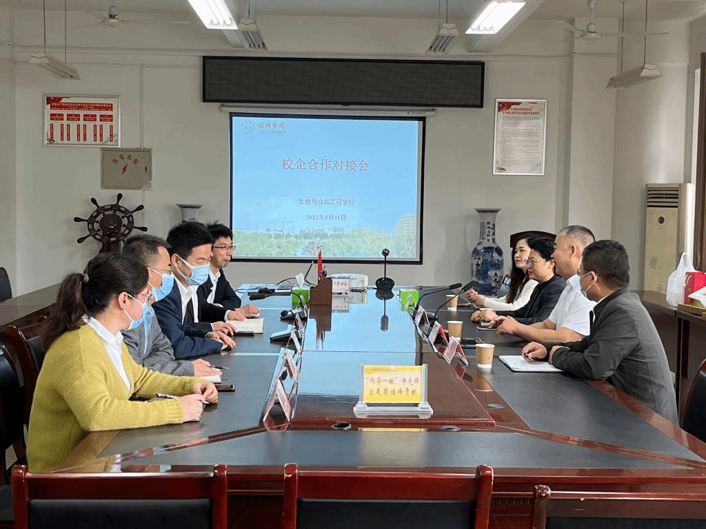 2022年5月11日上午,安徽瑞美药业股份有限公司董事长黄艳敏、总经理丁欢和宿州市徽香源食品有限公司董事长吴向东、总经理程迎九一行来到生工学院开展校企合作交流。生工学院党委书记赵亮,党委副书记、院长张兴桃,副院长王海潮,副院长翟科峰及鲍妮娜博士参加了此次对接会。