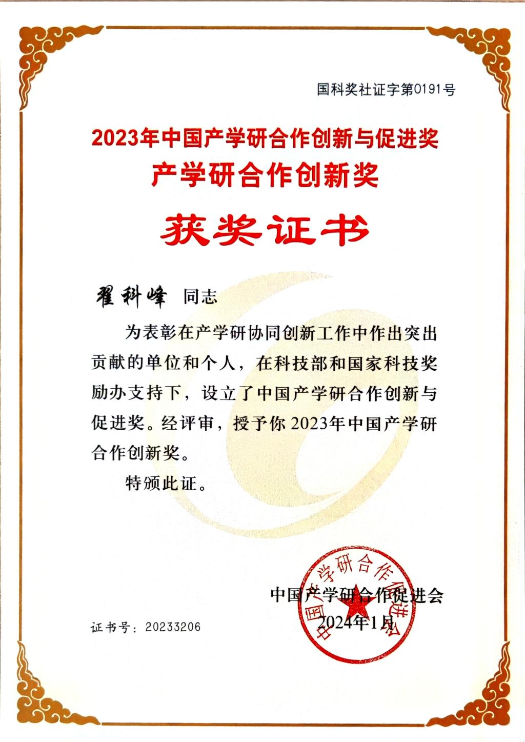 2024年3月17日,在北京盛大举行的第十五届中国产学研合作创新大会上,生物与食品工程学院翟科峰教授因其在皖北道地药材产业化开发领域的杰出贡献,荣获2023年中国产学研合作创新与促进奖。此项荣誉不仅是对翟教授长期以来科研工作和产学研合作成就的认可,也是对宿州学院在促进科技创新与应用转化方面努力的充分肯定。